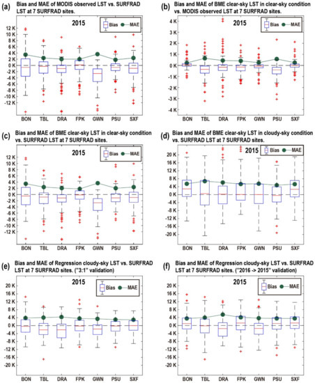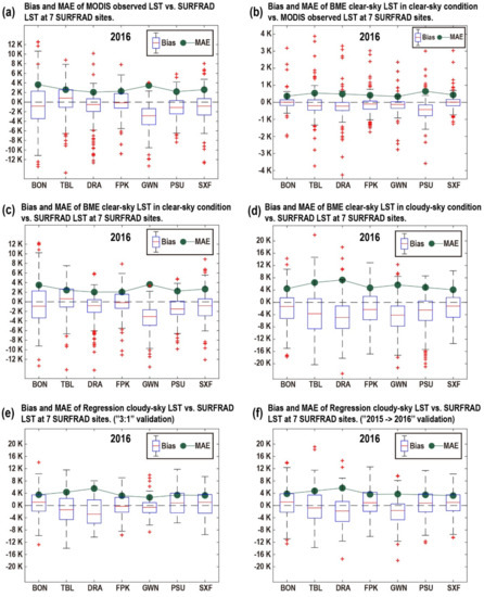 - Kou, X.; Jiang, L.; Bo, Y.; Yan, S.; Chai, L. Estimation of Land Surface Temperature through Blending MODIS and AMSR-E Data with the Bayesian Maximum Entropy Method. Remote Sens. 2016, 8. [Google Scholar] [CrossRef]
