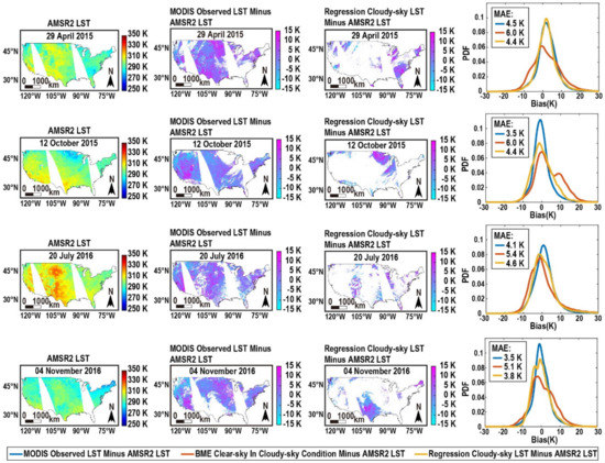 - Sun, D.; Li, Y.; Zhan, X.; Houser, P.; Yang, C.; Chiu, L.; Yang, R. Land Surface Temperature Derivation under All Sky Conditions through Integrating AMSR-E/AMSR-2 and MODIS/GOES Observations. Remote Sens. 2019, 11, 1704. [Google Scholar] [CrossRef]