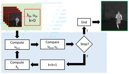 Figure 1 schematically illustrates the iterative process. The input values and are computed in advance by Equations (7) and (4), respectively. Hence, the algorithm is parameter-free. As a stop condition, we use (8).