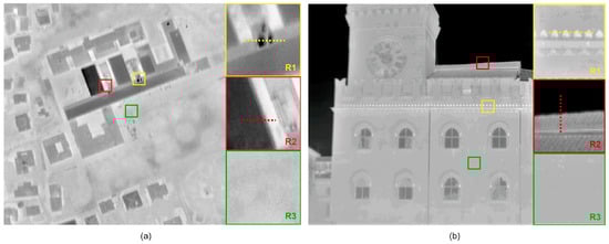 The first test image was constituted by an aerial thermal image (size pixels), representing the School of Engineering of Bologna University. It was part of the thermal aerial survey over the city of Bologna, held on 14 March 2016 in the framework of the ChoT (The challenge of remote sensing thermography as indicator of energy efficiency of buildings) project [32]. Only the most relevant characteristics of the survey are summarized here, and readers are referred to previous publications for further details [15,33]. The thermal camera used for the acquisition was a NEC TS9260, operating in the long wave infrared (7–16 microns) with a resolution of 480 × 640 pixels and a noise equivalent temperature difference of 0.06 °C. Considering the narrow field of view (21.7° × 16.4°), the flight height was set to approximately 800 meters above the ground, in order to obtain a ground sampling distance of about 0.5 m. More than 2500 frames were acquired to cover a total area of about 11 km2. In this scenario, not only may SR offer the opportunity to appreciate finer details of the imaged surfaces, but also to increase flight height and consequently reduce the number of frames to cover the same area. The aerial image used for the simulations is denoted by I1 in the following and is shown in Figure 2a. It was a raw uncalibrated frame, without any correction for emissivity and atmospheric effects.