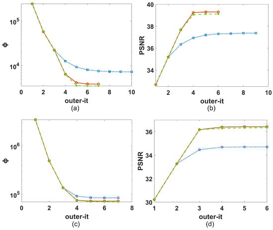 Comparison of ASRp results on SISR for (blue dotted line), (red continuous line), and (green dashed line). On the left: as a function of the outer iteration number for I1 (a) and I2 (c). On the right: PSNR values as a function of the outer iteration number (outer-it) for I1 (b) and I2 (d).