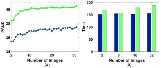 Results of the ASR2_m algorithm using an increasing number of input images for the test images I1 and I2. (a) PSNR versus the number of input images. I1: green dashed line; I2: blue continuous line. (b) Execution times in seconds. I1: green bars; I2: blue bars.