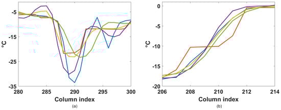 Figure 5a shows that the ASR2_s method worked better than the others on the cold spike in R1 ROI of I1 (Figure 2a), since it better approximated the extreme value. Figure 5b can be used to represent the behavior of the methods in reconstructing the edge of I1 in R2 ROI: we can see that the ASR2_m line was the closest to the ground truth.