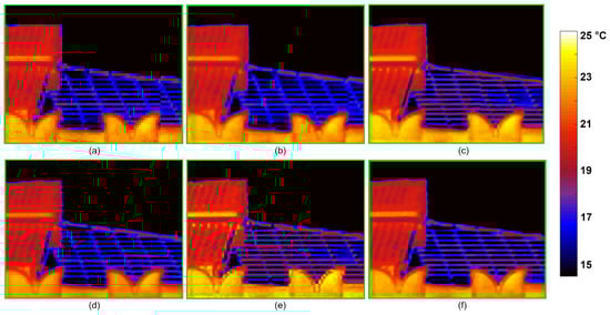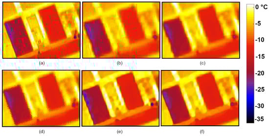 Comparisons among HR images obtained by different methods (detail of the I1 image). Hereafter, we recall the method and the real global Kelvin degrees range in brackets, since each image is depicted in the same color map. (a) Ground truth image ([−36.70, 5.28]). (b) Bicubic HR image ([−23.66, 1.84]). (c) EDSR HR image ([−23.89, 1.96]). (d) RISR HR image ([−25.13, 1.95]). (e) ASR2_s HR image ([−32.35, 2.77]). (f) ASR2_m HR image ([−25.51, 1.33]).