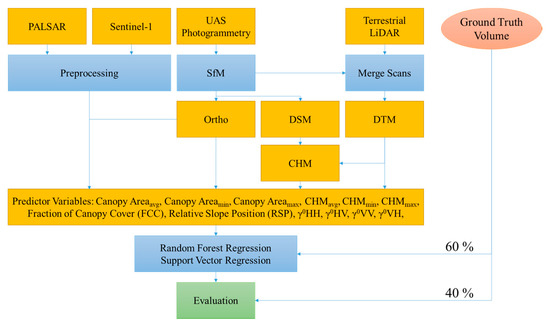 Flowchart of the methodology. Terrestrial laser scanning (TLS) was used for ground truthing and generation of the digital terrain model (DTM). A UAS was utilized for collecting aerial images, which were then processed to obtain a digital surface model (DSM) and orthoimages. Phased Array type L-band Synthetic Aperture Radar-2 (PALSAR-2) and Sentinel-1 data were preprocessed and used as independent variables. All variables were incorporated in the end with different regression analysis for the test.