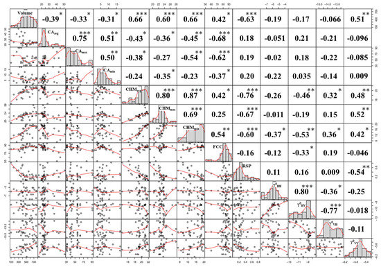 Correlation matrix with significant levels between stem volume and other 12 variables. Diagonal matrices show the histogram of the data distribution. The left half is the bivariate scatter plot with fitted line. The right half shows the Pearson correlation and the significance level associated with a symbol: p-values < 0.001 (***), < 0.01 (**), < 0.05 (*).