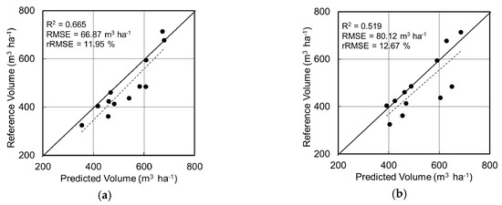 Model validation results from the regression analysis. Comparison of the reference and predicted stem volumes at each validation plots (indicated in Figure 6a) for (a) random forest regression (RFR) and (b) support vector regression (SVR). The figure shows the best result from the modelling. RFR = ModelRFR18; SVR = ModelSVR2. The solid black line indicates the 1:1 line. The dotted line is the linear trend line between the predicted and reference volume just for the visual reference, and it does not represent the R2 shown.