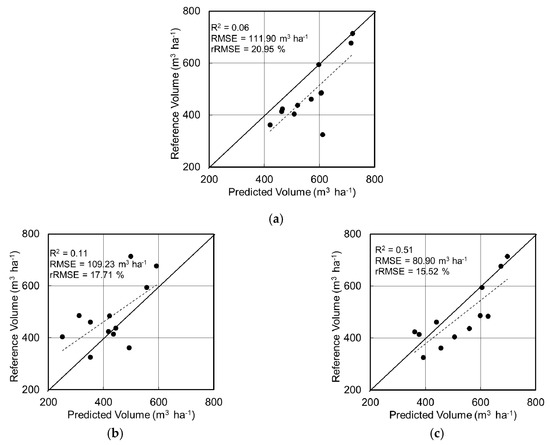 Results from the RFR analysis. Comparison of the reference and predicted stem volumes for additional models using, (a) minimum UAS variables (CHMavg, CAavg, FCC) (b) SAR variables, and (c) UAS+SAR variables. The solid black line indicates the 1:1 line. The dotted line is the linear trend line between the predicted and reference volume just for the visual reference, and it does not represent the R2 shown.