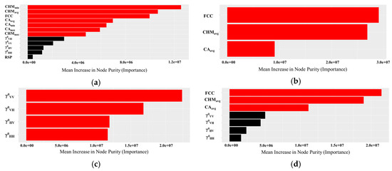 Importance of each variables explained as the mean increase in node purity (i.e., decrease in node impurity: Gini Index) for (a) ModelRFR23, (b) ModelUAS, (c) ModelSAR, and (d) ModelUAS+SAR. The upper shows more influential variables used in the random forest model for estimating stem volume. Red color bars indicates the parameter that significantly partitioned the data.