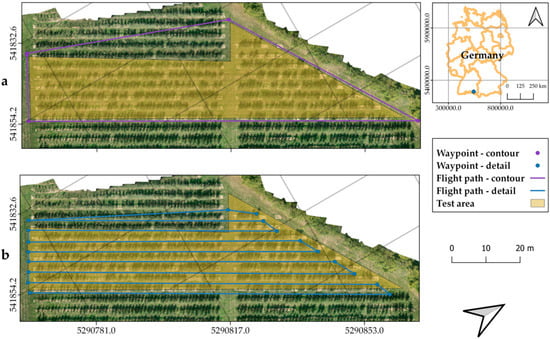 Unmanned aerial vehicle (UAV) flight plan for the test site: (a) contour flight and (b) detailed flight along the tree rows.