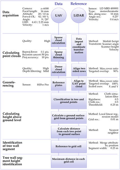 All tree point heights from the point clouds were then summarized along a 0.25 m georeferenced grid positioned along the tree rows by finding the maximum tree point distance in each grid cell using QGIS []. For this, each tree point height was perpendicularly projected into the grid cell by the merge attributes by position function. All points of the same cell got an identifier (ID) for labelling. For estimation of tree wall height per cell, the maximum value of z-coordinates was retrieved and stored for each point cloud. This way the contour of the tree wall as calculated from the UAV and LiDAR point cloud could be retrieved in a spatial resolution of 0.25 m. An overview of the whole data processing is shown in Figure 2.