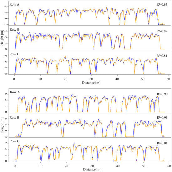 Figure 3 shows a comparison of UAV and LiDAR point clouds for the three apple tree rows A, B, and C for the years 2018 and 2019. The lines show the interpolated values of the maximum tree wall heights as found in each 0.25 m grid cell along the tree rows for both point clouds.