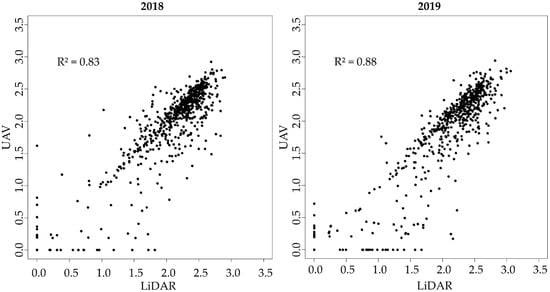 In Figure 4, all tree height estimations are pooled within a scatter plot showing the UAV data compared with the LiDAR data. With R2 values of 0.83 and 0.88 for 2018 and 2019, respectively, the estimated tree heights from the UAV model fit the reference model quite well. However, a general underestimation of the UAV point cloud leads to more right-shifted points. This effect is intensified by zero values in the UAV point cloud (17 and 21 of 706 data points in 2018 and 2019, respectively), based on widened tree gaps. Additionally, there were some zero values in the reference cloud (14 and 18 of 706 data points), where noisy points in the UAV model led to tree height estimations.