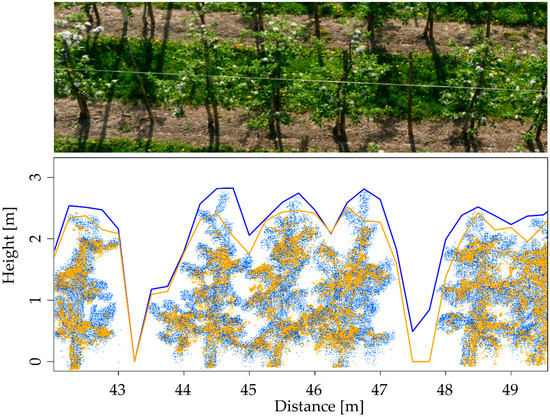 Detailed view of row A (42–50 m) in 2019 as an RGB image (top) and point clouds from UAV (orange) and LiDAR (blue) data superimposed with tree wall height curves from UAV (orange) and LiDAR (blue) model (bottom).