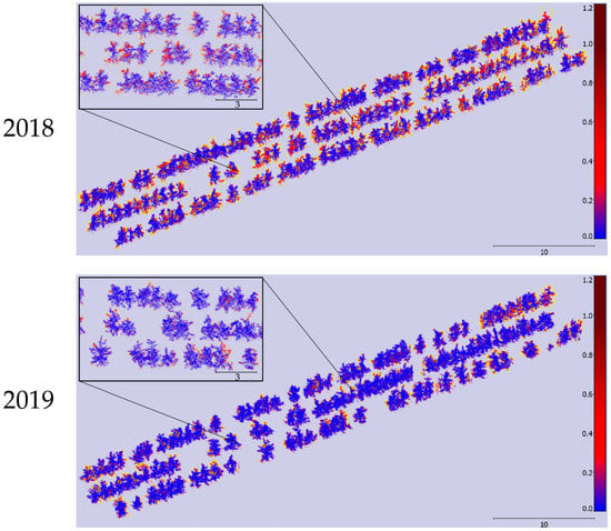 To analyze the UAV point clouds for missing branches, the function cloud-to-cloud distance in CloudCompare [] was used to calculate the point cloud distance. Here the distance from each point to the nearest point in a reference point cloud is calculated. For this analysis the LiDAR point cloud was compared to the UAV reference. In that way, points in the LiDAR cloud representing branches, which are missing in the UAV cloud, show further distance from their nearest neighbor. The result is a point cloud in which the distance to the reference point cloud of each point is displayed by a color scale. Thus, missing branches in the reference point cloud are highlighted. This analysis was completed for the years 2018 and 2019 individually. To keep the results comparable, the octree level setting, the level of subdivision of cubic volumes into which the cloud is divided, was kept stable at 10 for both calculations. To detect underestimated areas in the UAV point cloud, all points with a distance value of more than 0.2 m were extracted from these point clouds. The resulting sub point cloud was analyzed with the method Label Connected Components in the software CloudCompare []. A minimum cluster size of 30 points and a maximum distance of 48.6 mm between the points were set to filter single points. The combined clusters were counted and evaluated for the years 2018 and 2019, respectively.