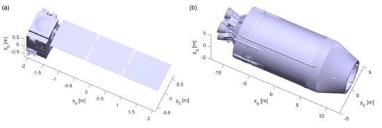 Two types of space debris were simulated to investigate the relationship between ELPW and orientation: defunct satellite (dimensions: 4.2 × 1.3 × 1.3 m) and rocket body (dimensions: 24.9 × 10.0 × 10.0 m). As shown in Figure 2, representing 3-dimensional models available from the NASA resources (https://nasa3d.arc.nasa.gov), the defunct satellite consists of a bus module, a solar panel, and small payloads, while the rocket body consists of five rocket engines, forward and aft skirts, tank and thrust structures, and an aft interstage. To generate the ELPW similar to the real measurement environment, the surface is made up of 113,241 grids for the defunct satellite, and 3,232,611 grids for the rocket body, respectively.