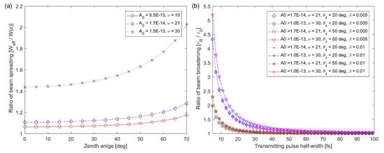 The temporal broadening of a laser pulse through the atmosphere is caused physically by two mechanisms: scattering process and beam spot wandering; these are too important to be neglected for high bandwidth signals such as narrow pulses in the range from femtosecond to picosecond []. The received pulse width broadened by the atmospheric turbulence is given by []
