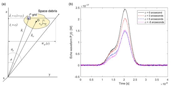 where is the light speed in a vacuum, and is the received pulse width, which is broadened by the atmospheric turbulence. The echo waveform model was also given by Hao et al. [] for the case of specular targets such as mirrors, which increases significantly the received power compared to diffuse targets. Space debris and most satellites are considered as diffuse targets since they are non-cooperative targets without CCRs and the echo signals are diffused from their surface.