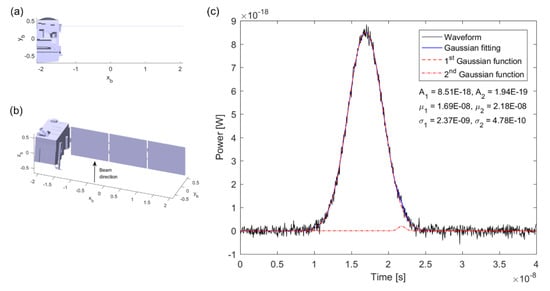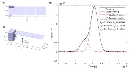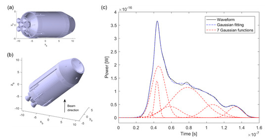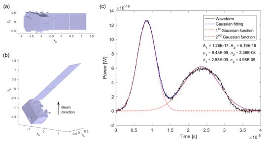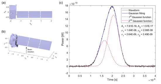 Figure 5, Figure 6, Figure 7 and Figure 8 show the echo waveforms as well as the Gaussian decomposition results for four orientations of the defunct satellite. The starting point of the range gate is determined to be arbitrary but the same for the simulations of four orientations (i.e., in the x-axis) in order to more easily compare and analyze the ELPWs. Unlike the Gaussian decomposition in Figure 8, the ELPWs in Figure 5, Figure 6 and Figure 7 were decomposed into two Gaussian functions because the reflected surface is characterized by two main elements: the bus module and the solar panel. The first Gaussian function is related to the bus module and the second one corresponds to the solar panel because the range to the bus module is shorter than that to the solar panel (i.e., ). The half-width of the first Gaussian function () in Figure 6 is larger than that in Figure 5 because the cross-section area of the reflected bus module is larger and consists of two surfaces of the bus module which cause larger roughness. The half-width of the second Gaussian function (), corresponding to the solar panel in Figure 6, is also larger than that in Figure 5 even though the cross-section area of the reflected solar panel is smaller than that in Figure 5. The larger value of results from the solar panel slope being normal to the beam direction (i.e., ) due to the 45° rotation about the x-axis. In the case of the defunct satellite orientation with -90° rotation about the x-axis as shown in Figure 7, the amplitude of the second Gaussian function is very small because the solar panel surface is perfectly parallel to the beam direction and thus the cross-section area is small. As shown in Figure 8, the second Gaussian function cannot fit the second curve in the ELPW well, which implies that the reflected surface is more complex than shown in Figure 5, Figure 6 and Figure 7 and the second curve is not separated into the bus module and solar panel elements.