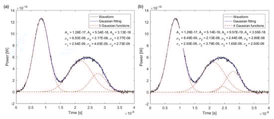 The returned laser pulses are distorted by the cross-section characteristics (i.e., the scattering properties of targets) even though the transmitted pulses are Gaussian functions. However, it is assumed that the returned laser pulse from a small grid follows a Gaussian distribution in the time domain and then the ELPW summing the returned pulses is also represented by a series of Gaussian functions []. According to the analysis work of returned waveform [], more than 98% of the observed waveforms with a topographic lidar could be correctly fitted with the sum of Gaussian functions. Therefore, the ELPW can be fitted with a mixture of Gaussian functions as follows []: