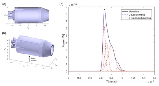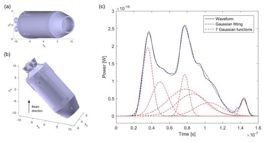 The (a) reflected surface, (b) orientation of rocket body, and (c) the echo waveform and 7 Gaussian functions obtained from the Gaussian decomposition for −45° rotation about the y-axis w.r.t. Figure 2b.