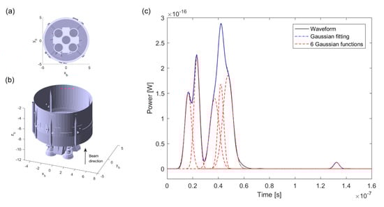 The (a) reflected surface, (b) orientation of rocket body, and (c) the echo waveform and 7 Gaussian functions obtained from the Gaussian decomposition for 45° rotation about the y-axis w.r.t. Figure 2b.