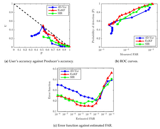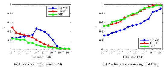 User’s accuracy (U) and producer’s accuracy (P) computed per estimated FAR are shown in Figure 1a and Figure 1b, respectively. The two accuracies are derived from the fire results of the proposed fire detection algorithms in the study area for the period of 31 July 2007 to 4 August 2007. The validation reference data are made of a combination of EUMETSAT FIR, and MODIS MOD14/MYD14 reports. MODIS detection time is rounded off to the nearest MSG-SEVIRI detection time (detection time is ahead of Level 1.5 observation time). performs better than other detection methods in terms of U (gives less commission errors) except at the low estimated FARs. However, the low estimated FAR region was not considered during the design of the CFAR detector (the estimation of FAR starts from to as indicated in Section 2.2). For the estimated FARs in the low FAR region (i.e., high threshold values), can produce a lot of false alarms given that the assimilation window of 4D-Var is more likely to contain more missed fire samples. performs worse than both and in terms of U. At high estimated FAR, all methods give similar results in terms of U. Overall, performs better than other methods in terms of P (low omission error or high probability of detection), and at some estimated FARs, it performs more like .