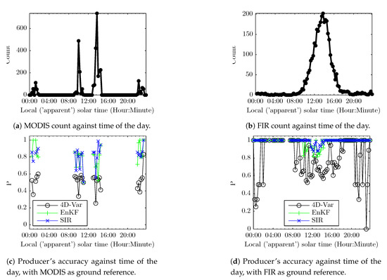 Figure 4a,b present number of fire events at each time of a day (where times are expressed in terms of local solar time) for MODIS MOD14/MYD14 product and EUMETSAT FIR product, respectively. The values of producer’s accuracy (or true positive rate) of the proposed detection algorithms at each time of a day are presented in Figure 4c,d for cases the validation reference dataset is made of MODIS MOD14/MYD14 product only and EUMETSAT FIR product only, respectively. Fires recorded by EUMETSAT FIR are significantly detected by and detection methods at FAR with outperforming other methods in detection of MODIS night fires. Their detection performance is reduced from around (i.e., the time of the maximum thermal radiation) to around (onset of the nighttime temperature decay) with respect to EUMETSAT FIR and MODIS MOD14/MYD14 results, and such performance can be viewed to be more associated with a high number of fire events reported by both MODIS MOD14/MYD14 and EUMETSAT FIR products in the time range. During time of a high number of fire events, a proposed algorithm can miss a fire event reported by the fire products but can report a fire before or after the fire product reports. Furthermore, the observed temperature in MSG spectral channel of an MSG pixel identified by MODIS to be affected by fire, might not deviate significantly from its expected background temperature. has an overall low detection, especially during the nighttime—the time of high fluctuations in brightness temperatures due to different coupled land–atmosphere phenomena, such as orographic forcing effect. In the afternoon, its low detection is more explained by the DTC linearization from around to around (or likewise, based on the approximate observation operator given by Equation (S8)). The detection rate of MODIS MOD14/MYD14 report is low compared to the detection rate of EUMETSAT FIR reports, and and perform better in detecting MODIS MOD14/MYD14 reports compared to at the 4 MODIS overpass times ( is better than all detection methods during the night). Based on the MODIS MOD14/MYD14 report, all detection methods certainly detect both daytime and nighttime fires, with to a lower extent. Noting that MODIS detection time is rounded to the nearest SEVIRI detection time, and the number of ‘fire pixels’ is counted in terms of MODIS pixels to determine the true positive rate (P), according to MODIS MOD14/MYD14 product.