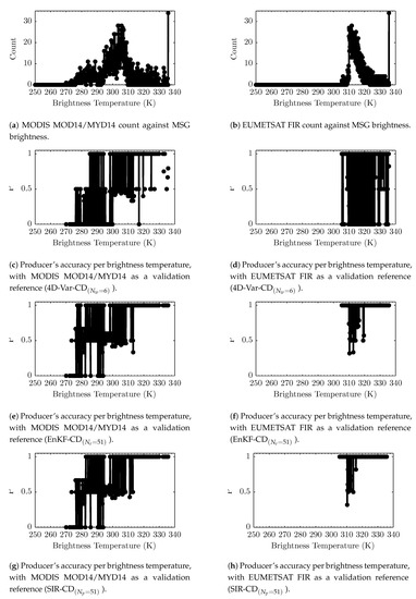 The empirical distribution of MSG brightness temperatures for MODIS MOD14/MYD14 reported fire pixels and EUMETSAT FIR reported fire pixels are shown in Figure 5a,b, respectively. MODIS detection time is rounded off to the nearest MSG-SEVIRI detection time. For MODIS MOD14/MYD14 reported fire pixels, the temperature value of an MSG pixel containing the centers of a number of MODIS fire pixels at a given time step k is counted as many times as the number of the centers of the MODIS pixels. For fire detection results of method, producer’s accuracy for each MSG brightness temperature value is shown in Figure 5c,d when the validation set is made of MODIS MOD14/MYD14 product and EUMETSAT FIR product, respectively. is able to detect cooler fire compared to EUMETSAT FIR, down to approximately a brightness temperature value of (with ), as shown in Figure 5c when only MODIS MOD14/MYD14 product is accommodated in the validation set. Some very hot fires are missed by , especially at the SEVIRI’s saturation point (which can be attributed to the linear approximation of the observation function and the data assimilation window that does not contain only clean samples). For fire detection results of the method, producer’s accuracy for each brightness temperature value is shown in Figure 5g,h when the validation set is made of MODIS MOD14/MYD14 product and EUMETSAT FIR product, respectively. reports cold fires more frequently than , and can detect fires with brightness temperatures below (with ) as shown in Figure 5g. For fire detection results of method, producer’s accuracy for each brightness temperature value is shown in Figure 5e,f when the validation set is made of MODIS MOD14/MYD14 product and EUMETSAT FIR product, respectively. Similar to and methods, the method is able to detect cooler fire compared to EUMETSAT FIR, even for fires with a brightness temperature value below (with ) as shown in Figure 5e when only the MODIS MOD14/MYD14 product makes the validation set.