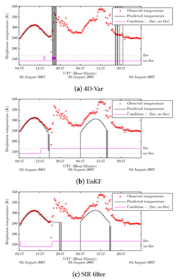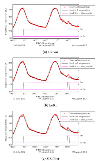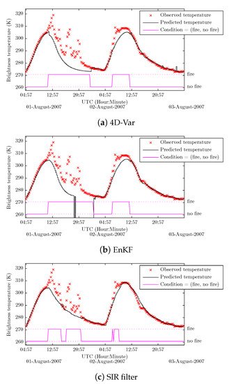 Observed data are assimilated into the background DTC model. In this study, the data assimilation is implemented at each time a new observation is flagged as a non-fire observation (i.e., fire-contaminated samples are not assimilated). The data assimilation aims to derive better initial conditions of forecasts. The data assimilation and the forecast model of the background temperatures are presented in Section S1 of the Supplementary Materials to this article. The expected background temperature of a pixel is derived from the forecasts initiated at the time of the assimilation of data. The forecast is achieved using the ensemble forecasting scheme, described in Section S1 of the Supplementary Materials of this article. The shortest-range ensemble forecasts of brightness temperature verifying at the inspection time k in a pixel location represent the distribution of the background (non-fire ) temperature of the pixel location at time step k. The mean value of this ensemble is the expected value of the background (non-fire ) temperature of the pixel location at a time step k. The initial condition of the forecast is derived using the weak constraint 4D-Var with a data assimilation window of length , the EnKF with number of ensemble , and the SIR particle filter with number of particles .