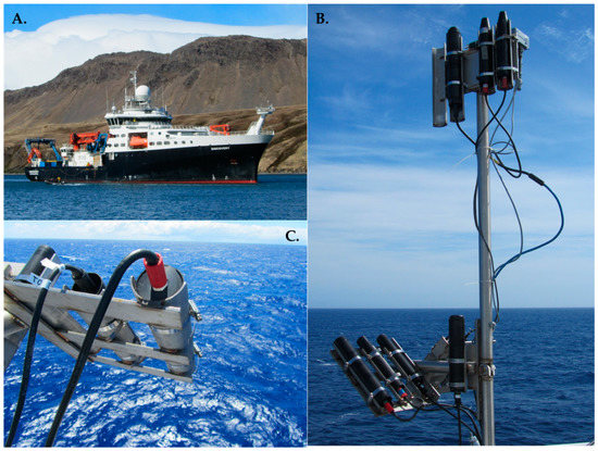 Radiometer set up on RRS Discovery; (A) showing the location of the meteorological mast on the bow of the ship where the radiometers were located; (B) Purpose-built frame for locating the sensors, side by side; (C) View of upwelling radiance sensors.