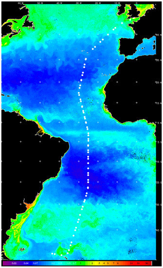 The AMT27 field campaign took place from 23rd September to 5th November 2017 from Southampton, UK to South Georgia and the Falkland Islands on the UK-Natrual Environment Research Council (NERC) ship Royal Research Ship (RRS) Discovery. The AMT is a multidisciplinary research program, which undertakes biological, chemical, and physical oceanographic research during an annual voyage between the UK and destinations in the South Atlantic. The program has been running for 20 years and was established in 1995, in collaboration with National Aeronautics and Space Administration (NASA), as an independent platform to validate Sea-Viewing Wide Field-of-View Sensor (SeaWiFS) ocean color data. The transect covered several ocean provinces where key physical and biogeochemical variables, such as chlorophyll, primary production, nutrients, temperature, salinity, and oxygen, were measured. The stations sampled were principally in Case 1 waters [13,14]; in the North and South Atlantic Gyres, but also the productive waters of the Celtic Sea, Patagonian Shelf, and Equatorial upwelling zone were visited, which, therefore, offered a wide range of variability in which to conduct field intercomparisons. The measurement stations are listed in Table 1; Sentinel-3A OLCI quality controlled match-ups were available for station id-s 22, 32, 46, 48, 56.