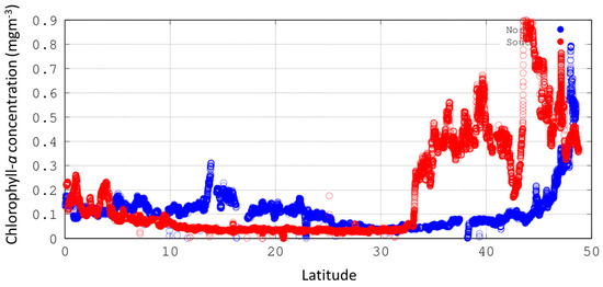 Chl a concentration derived from WetLABs absorption-attenuation measurements (ac-S) along AMT27. Blue points are for Northern latitudes; Red points are for Southern latitudes.