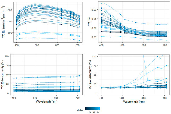 The initial spectra (Figure 4) showed two potential outliers from stations 67 and 50, respectively, the lowest and highest spectra in Figure 4. While from station 67 could be explained by poor measurement conditions (Table 1), the measurement conditions were optimal in station 50. Besides, as both radiometric systems resulted in the closely similar shape and absolute values of at these stations, these spectra were included in further analyses in order to show the resulting processing steps.