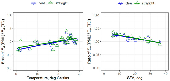 Differences in downwelling irradiance between PML and TO as a function of SZA showed that the variation was in agreement with known or expected errors of the cosine collectors of the sensors, which were within ±3% [11]. The ratio of -s showed no correlation with SZA or temperature, while the ratio of showed the opposite pattern compared to the ratio for -s, as expected. By comparison with the temperature and angle effects, straylight effects were negligible and given in Figure 5 for reference only.