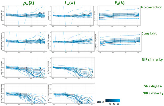 A comparison between the PML and TO radiometric systems is shown in Figure 6. Results are given as ratios (PML/TO) for , , and , with and without the NIR similarity correction (not applicable in the case of ). The outliers for , ratios, without any correction (left panel on Figure 6) and with straylight correction (middle panel in Figure 6), originated from station 67. After NIR similarity correction, the consistency between TO and PML radiometric data was poorer, although there were no distinct outliers (Figure 6).