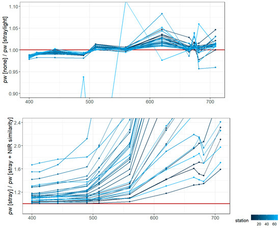 The straylight effects for individual sensors, as well as for the derived quantities, were mostly within ±3%, which was consistent with previous results [10,11,36]. The effect of straylight correction on the is shown in the upper panel of Figure 7. The straylight correction was applied to all of the data, regardless of the other corrections. The NIR similarity correction [25,26], on the other hand, changed the and spectra significantly and converged the outliers closer to 1 (Figure 6, Figure 7, lower panel). The NIR similarity correction removed the shift in (and ) spectra, which was probably caused by high tilt, waves, and skyglint. While the agreement between the two in situ radiometric systems could be satisfactory or even better without the NIR similarity correction (Figure 6, Figure 7), distortion of the spectra was evident (Figure 13), and the comparison with satellite data showed significant bias without the NIR correction (Figure 13).