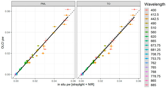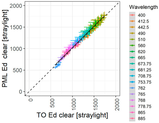 Agreement between values as measured by PML and TO, after correcting for straylight only or after applying straylight and NIR similarity corrections, is shown in Figure 12 and Figure A6.