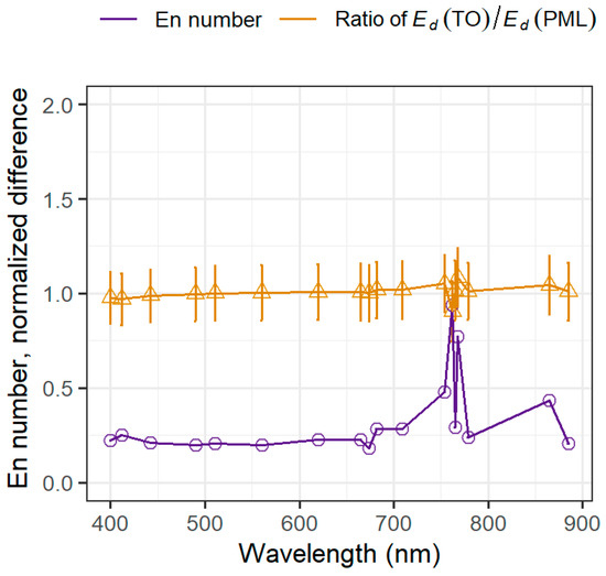 In order to compare measured by the RAMSES and HyperOCR instruments, only clear sky conditions were used (Figure 8, Figure A2). First, individual spectra were screened for the irradiance threshold of 1200 mW/m2 at 560 nm. The resulting dataset was further reduced by rejecting all stations with an expanded uncertainty of more than 5%. As a result, 10 stations were included in the comparison of (Figure 8) from the whole dataset (Figure A3). The average ratio between PML and TO over all 32 stations, together with the expanded uncertainty, is shown in Figure 9. The median of En numbers of individual station ratios is shown in Figure 10 as well.