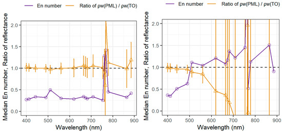 Comparison PML/TO averaged results for , before (left) and after (right) NIR similarity corrections. Mean ratio with uncertainty bars—yellow line (triangles); Median of respective En values—purple line (circles).