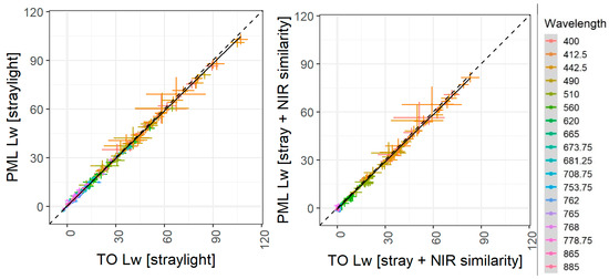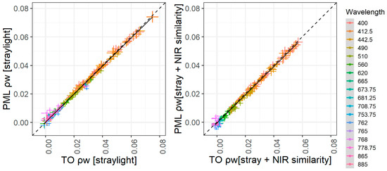 Comparison between TO and PML after straylight (left) and straylight + NIR similarity correction over all OLCI’s band. The comparison in each band separately can be found in Figure A6 for straylight correction.