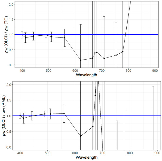 The estimation of the uncertainty of the ratio of OLCI and in situ was up to 40% (Figure 15). The combined uncertainty for the ratio of (OLCI) and (in situ) (Figure 15) was within (10…16)% for the (400…510) nm, 39% for 560 nm, and above 100% for longer wavelengths, where the signal was very small (Figure 15). The contribution from in situ uncertainty was (6…7)% for bands (400…510) nm, about 11% for 560 nm, and 30% for longer wavelengths. The difference in the mean uncertainty between the TO and PML was within 1% for bands up to 510 nm and increasing towards longer wavelengths.
