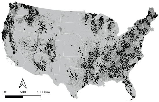 A sample of 3828 forested Landsat pixel (i.e., plot) locations, selected via a two-stage stratified cluster design, was used in this study (Figure 1). This sample (trimmed from the original 3861 locations), along with the broad mix of forest types it contained and the estimation strategy, was thoroughly described in Cohen et al. [20], where it was used to estimate forest disturbance trends between 1985 and 2012 across the conterminous United States. For that study, disturbance data for the sample were collected with TimeSync, a tool for Landsat time-series visualization and disturbance data collection [26]. For a given plot, the Landsat time series consisted of, to the extent possible, one growing season cloud-free Landsat image chip (256-by-256 image pixels, centered on the plot) per year.
