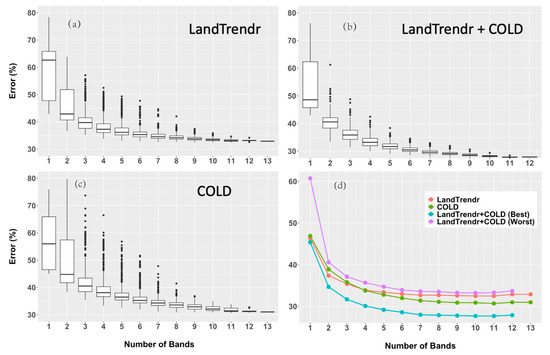 As described earlier for the band weighting scheme, the top five models for each N were used to select the six best bands from each algorithm to include in the multialgorithm, multispectral ensembles. Examining the mean errors for the top five models we see that those decreased with increasing N, but generally reached an asymptote by N = 7 (LT) or 9 (COLD) (Figure 2d, Table 1). It is worth noting that the distribution of errors for LandTrendr were somewhat greater here compared to similar results in Cohen et al. [24]. This is likely due the fact that different Landsat plot locations were used between the two studies, suggesting that LandTrendr performed less well across the greater diversity of forests represented by the plots in this study (a similar observation to that of Cohen et al. [19]).