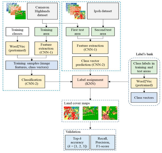 Then, CNN-2 is used to map the image vectors to the class signature. In the test area, first, the image is fed to the trained CNN-1 to extract the image features. The ZSL classes are then fed into another Word2Vec model (which acts here as an auxiliary label’s bank) to extract the class signature. To avoid predicting labels for unseen classes that are not relevant to land cover applications, we used the KNN model to find labels from a label bank created for the purpose of land cover mapping. It contains labels only suitable for land cover e.g., agricultural land, barren land, road, forest, and urban area etc. Thereafter, the CNN-2, which is trained on the training dataset, is used along with the image features to predict the class signature from the label’s bank [41]. Once the class signature is predicted, the class labels are determined by the KNN algorithm to measuring the similarity between the predicted class signature and the class signature, which was pre-computed from the label’s bank for all possible class labels. Lastly, the predicted class labels are used to produce the land cover map for the area.