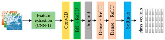 Figure 3 shows the architecture of CNN-2 used for class signature prediction given the image vectors. This model was chosen due to the general robustness of CNNs over the traditional classification techniques in land cover classification [20]. The model consists of a convolutional layer with ReLU activation. The number of filters in this layer was 128. We included a batch normalisation with ReLU to expedite convergence and introduce regularisation within the network. A dropout layer is then added to avoid over-fitting with a drop probability of 0.3. Thereafter, we added two dense layers with ReLU activations. The number of units in the first dense layer was 64. The second dense layer takes the number of attributes (300), which is pre-trained by Google News. The target kernel is initialised with the class signature pre-computed by the Word2Vec model. The final layer is softmax with aims at classification. The model is trained with an Adam optimiser (initial learning rate = 0.001) with a batch size of 2048 for 100 iterations. Table 1 presents the parameters of the CNNs set in this study. Different and several hyper-parameters were tested during the design and optimisation process for the CNNs configuration. The best result was obtained using the aforementioned parameters. Moreover, by adding more layers, no constructive progress was observed (experiments with details are provided in the experimental set-up of CNN-2).