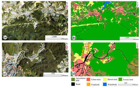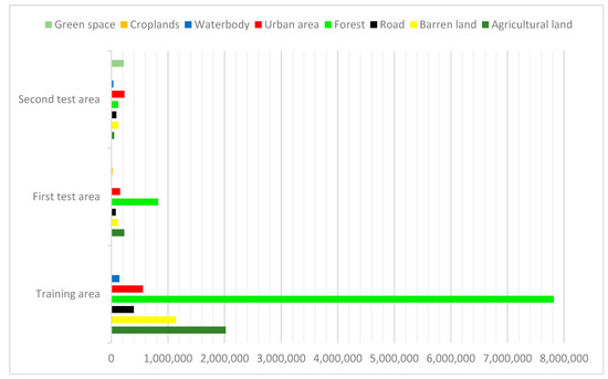 In this research, orthophotos acquired over the Cameron Highlands, Malaysia, on January 15, 2015, by using an airborne system (RIEGL) with an RGB camera, were used as the first dataset. The average height of the system whilst collecting data was 1510 m. The spatial resolution of the data was 1 m. Two subset areas were selected for training and testing the proposed ZSL framework. The training area consisted of six types of land covers, namely, agricultural land, barren land, road, forest, urban area and water body. The test area included five types of land covers (agricultural land, barren land, road, forest and urban area) with an additional class (croplands). Figure 4 presents details about the number of pixels for each class in the first training and test areas. For the training area, agricultural land contained 2,021,470 pixels, followed by barren land with 1,142,705 pixels. Road, forest lands, urban areas and water body contained 395,206, 7,819,007, 558,300 and 142,896 pixels, respectively. In total, the number of training pixels was reported at 12,079,584 for all classes with a dimension of 4464 × 2706 × 3. The test area contained 1,423,087 pixels with dimensions of 863 × 1649 × 3. Agricultural land contained 229,060 pixels, followed by barren land with 113,040 pixels. Road, forest lands, urban areas and croplands contained 76,436, 829,964, 152,786 and 21,801 pixels, respectively. Figure 5 exhibits the maps of the first training and test areas, including the orthophotos and ground truth data.