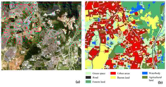 To further assess the performance and robustness of the current ZSL framework, a second dataset also was tested. The new dataset was taken from the Ipoh area (in Peninsular Malaysia) on January 15, 2015, by using an airborne system (RIEGL) with an RGB camera and the average height of the system whilst collecting data was 1000 m. The area contained seven land cover types including green space, road, urban area, barren land, forest, water body and agricultural land. Figure 4 presents the number of ground truth pixels for each class. The maps of the second test dataset, including the orthophotos and ground truth data, are shown in Figure 6.