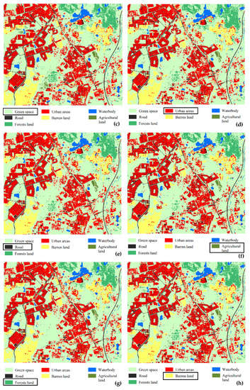 To evaluate the transferability of the proposed framework, the entire process was applied to the second test dataset. The visual interpretation illustrated that the area consisted of diverse land cover types, including green space, urban areas, road, agricultural land, forest lands, barren land, and water body. The image was taken from a similar geographical environment to the first dataset; therefore, the same set of hyper-parameters was employed for CNNs. Figure 8 demonstrates the classification result for seven scenarios of unseen classes.