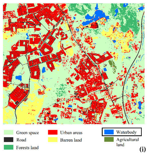 (a) Second test dataset (Ipoh area), (b) Ground truth map of the second test area, and classification results of the testing area with different unseen classes, (c) green space, (d) urban areas, (e) road, (f) agricultural land, (g) forest lands, (h) barren land, and (i) waterbody.